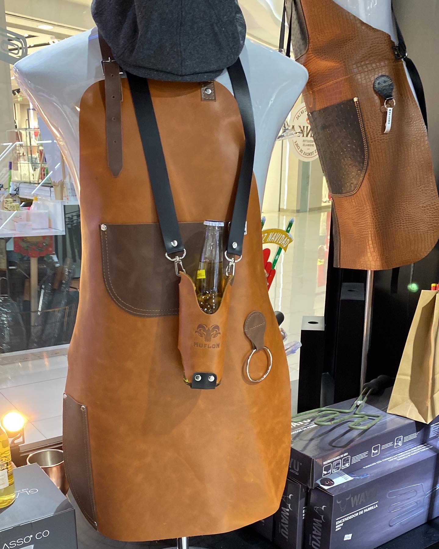 Pechera de Cuero liso café, con bolsillo multiuso, porta cuchillo, regulable en el cuello, argolla y broches de seguridad en todas las costuras, medidas 47 x 72 cm.