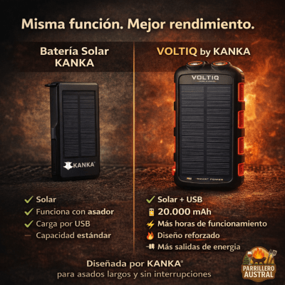 Durante años, la batería Recargable + Solar KANKA® se convirtió en un accesorio fundamental para quienes usan el Asador KANKA®. Su confiabilidad y autonomía la hicieron parte habitual de muchos quinchos y asados al aire libre.